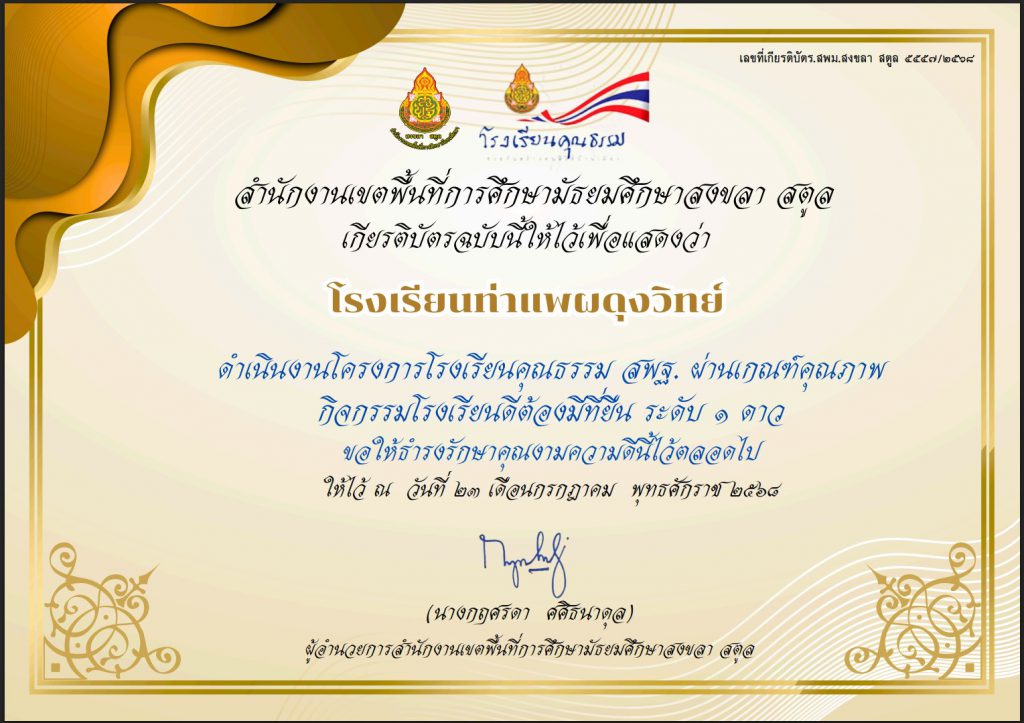 โรงเรียนท่าแพผดุงวิทย์ > ข่าวทั่วไป > โรงเรียนคุณธรรม สพฐ. ผ่านเกณฑ์คุณภาพ ระดับ 1 ดาว