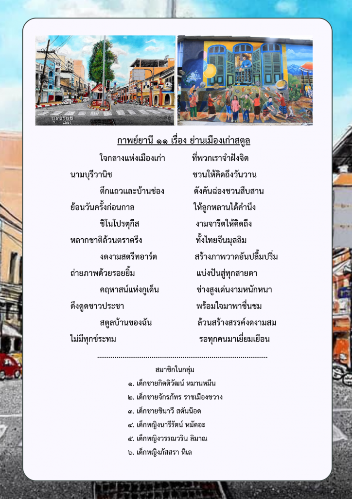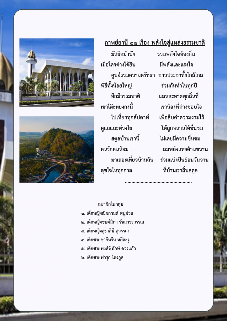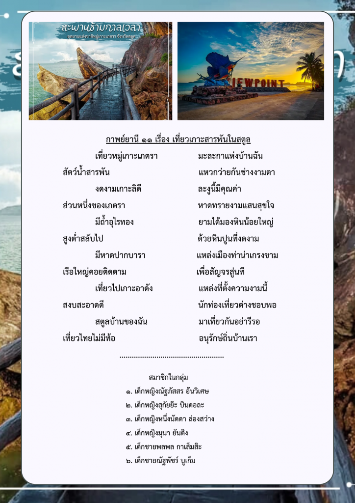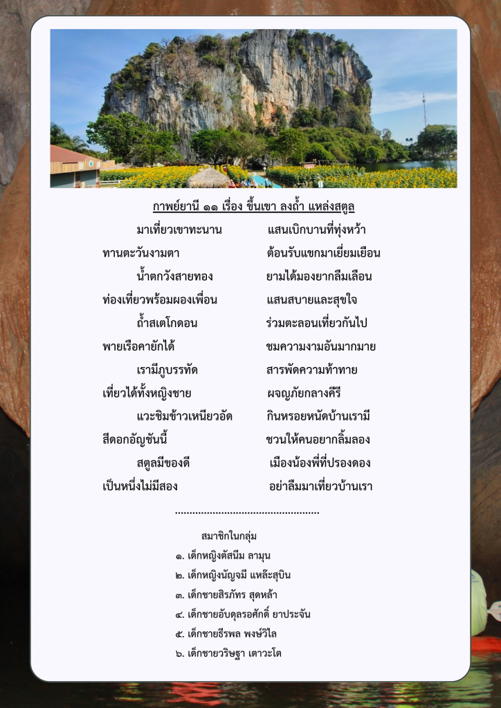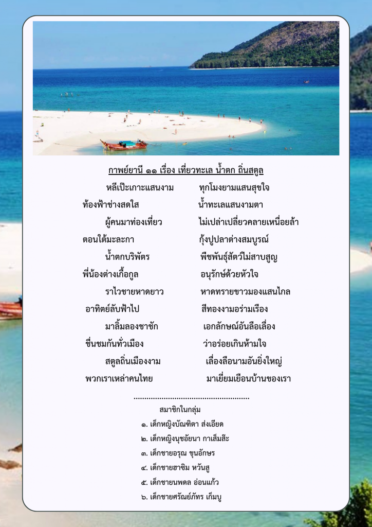 ผลงานกลุ่มของนักเรียนระดับชั้นมัธยมศึกษาปีที่ ๑ ภาคเรียนที่ ๑ ปีการศึกษา ๒๕๖๘ โรงเรียนท่าแพผดุงวิทย์ เรื่อง การแต่งกาพย์ยานี ๑๑ ในหัวข้อ “สถานที่ท่องเที่ยวที่มีชื่อเสียงและของดีจังหวัดสตูล” โดยใช้รูปแบบการสอนแบบกระบวนการเรียนรู้แบบรวมพลัง ๕ ขั้นตอน (Collaborative learning Process : CO-๕STEPs)